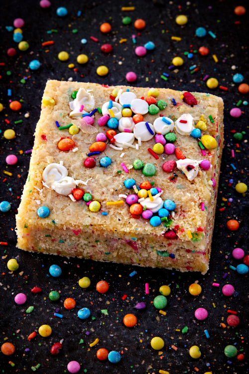 Buttery blondie indulgence packed with white chocolate chips, candy-coated crunch, and baked-in rainbow sprinkles, finished with a celebratory drizzle that turns every bite into a reason to keep going. One wish is never enough.